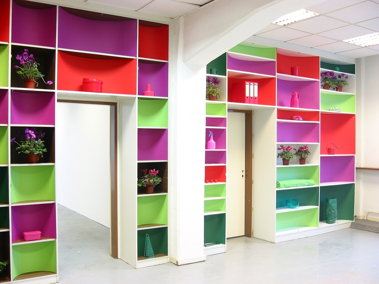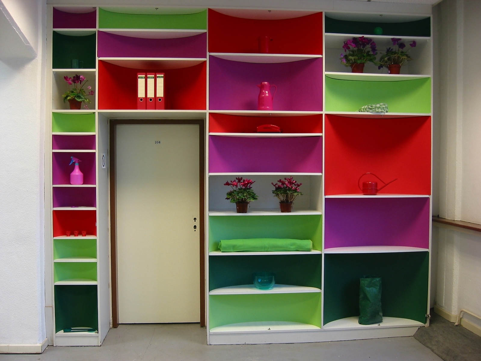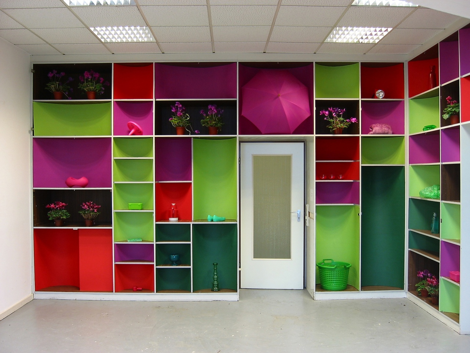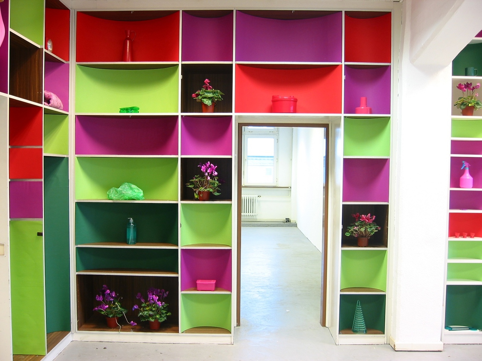 Alles in Ordnung Installation aus farbigem Papier, Gebrauchsgegenständen und Alpenveilchen in vorgefundenen Einbauschränken gezeigt im Rahmen des Ausstellungsprojekts „ortstermin“ Düsseldorf 2004 Fotos von Susanne Brodhage