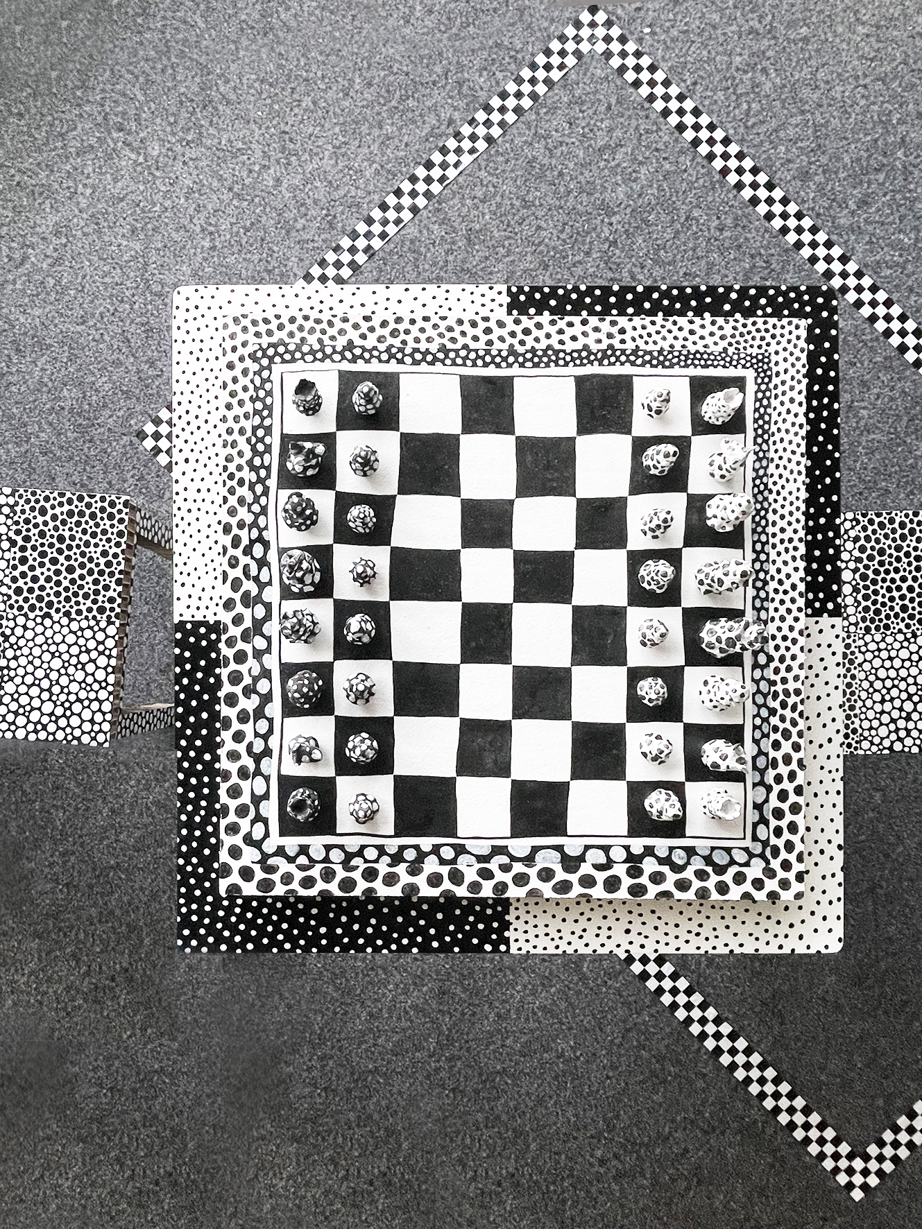 Inszenierung bestehend aus einem Schachspiel, Tisch und Stühlen, bemalt