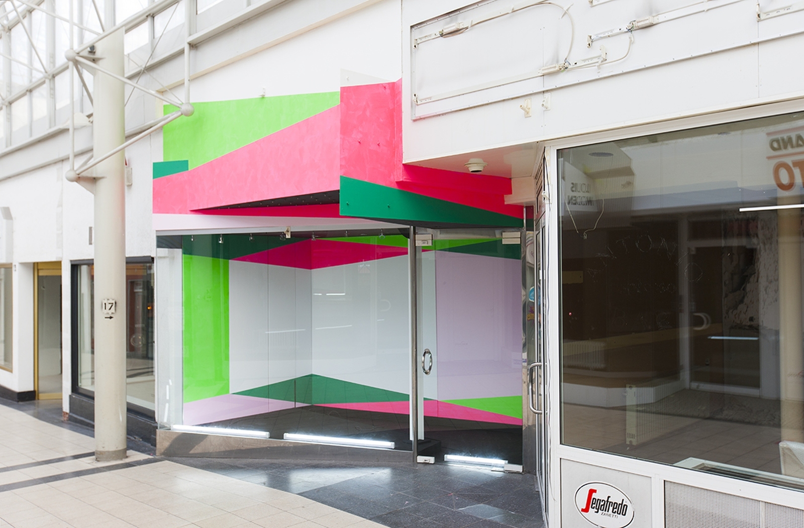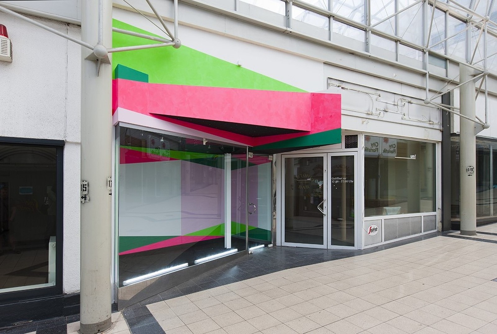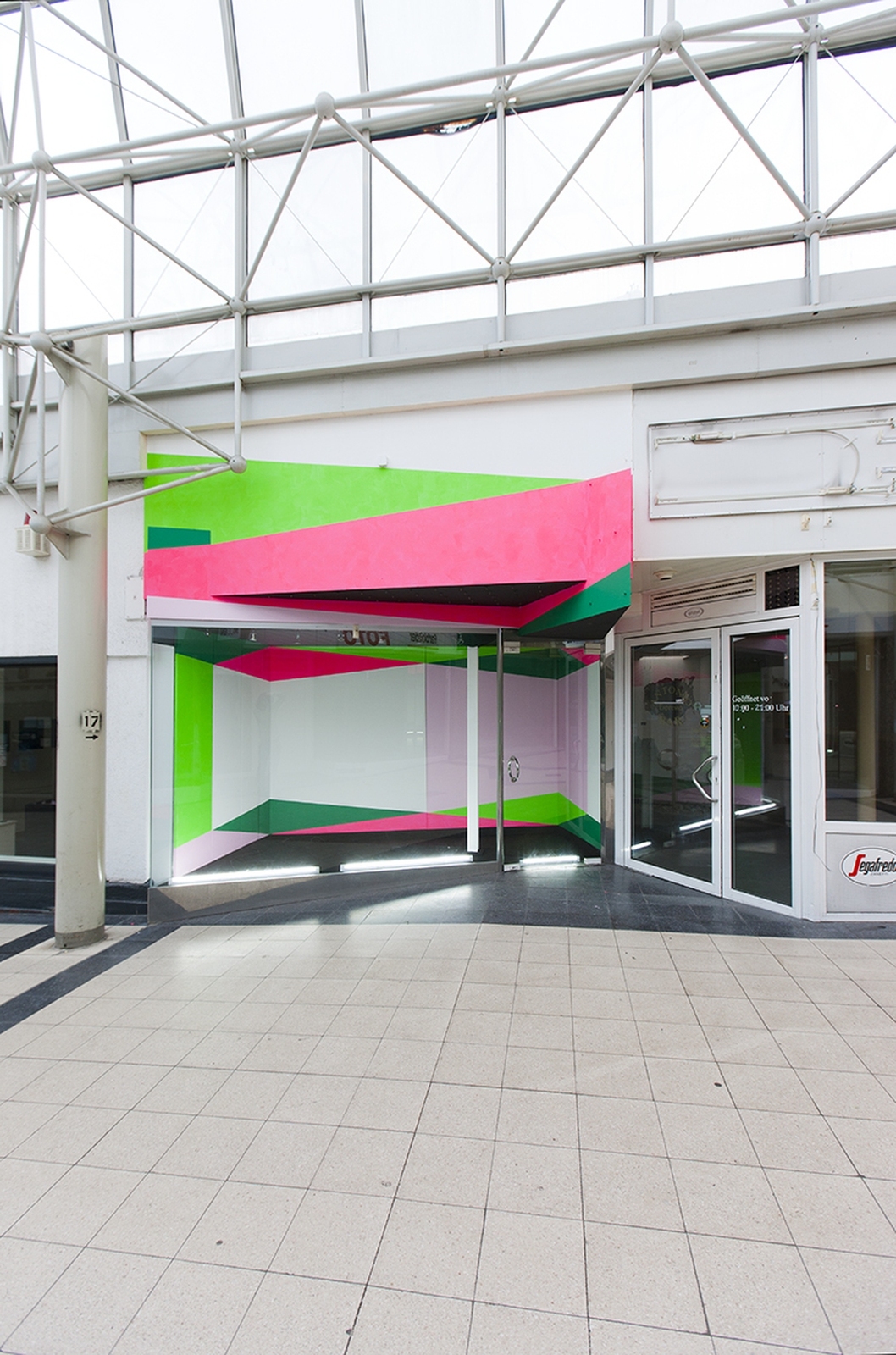 Fachgeschäft 7 Malerei auf Putz und Leinwand in einem ehemaligen Geschäft in der Ladenpassage Lichthof Ausstellungsprojekt „21 Fachgeschäfte“ Mischpoke e.V. Mönchengladbach 2012 Fotos von Stefan Sturm