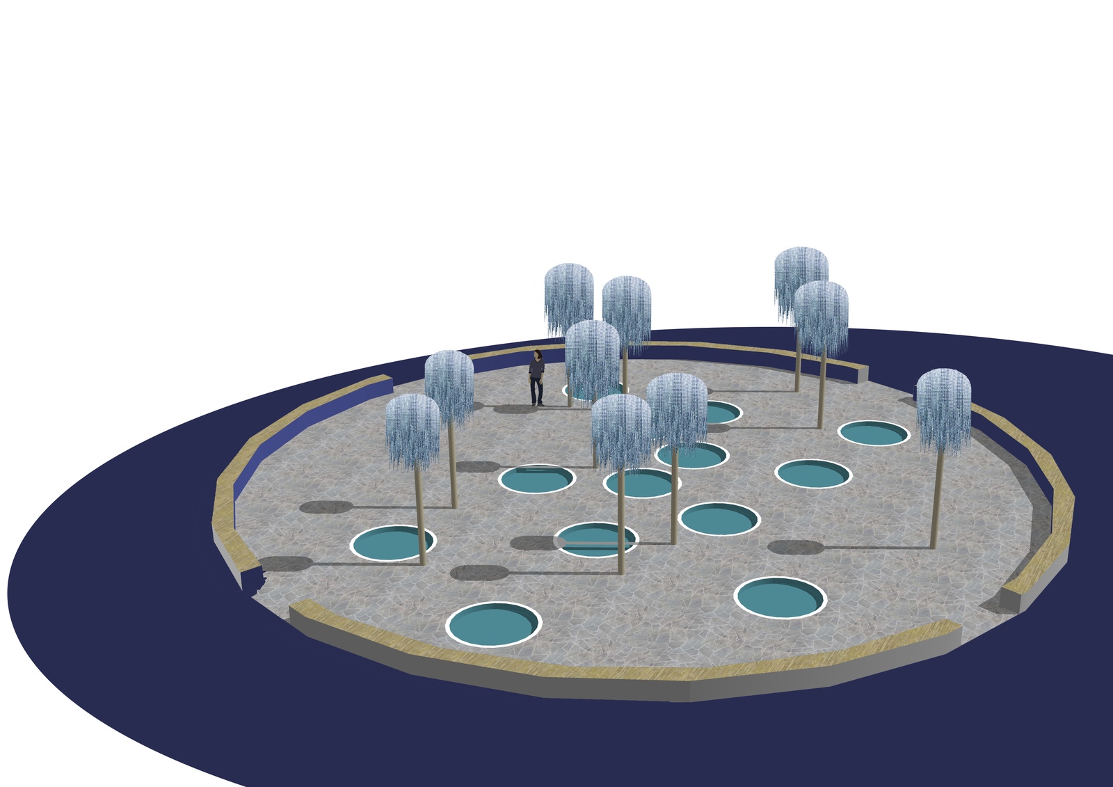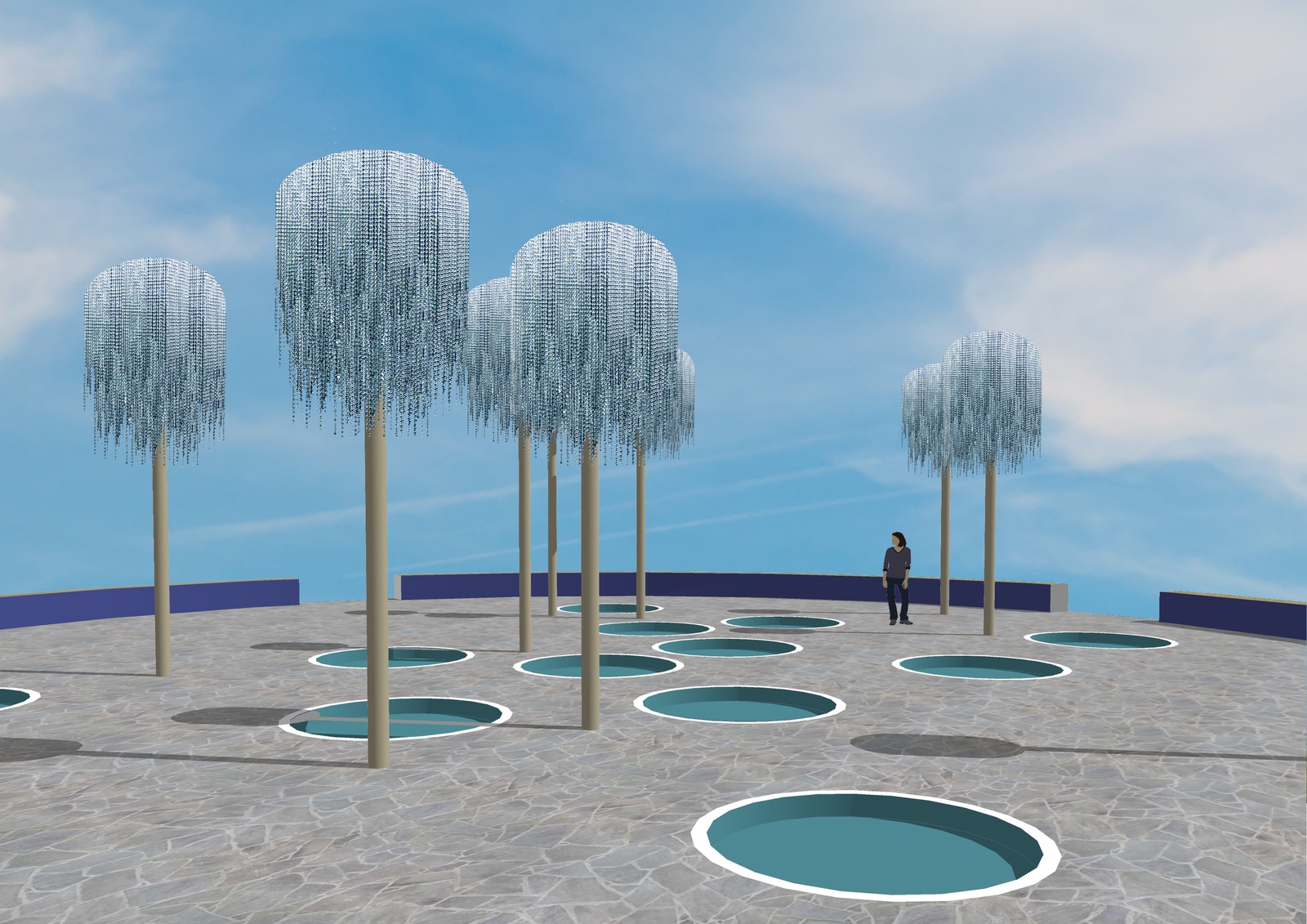 Entwurf für die Gestaltung von „Weidenbergs neuer Mitte“ mit leuchtenden Bäumen aus Lüster-Glasbehang und runden Wasserflächen