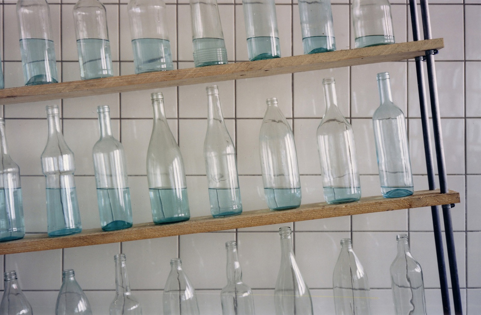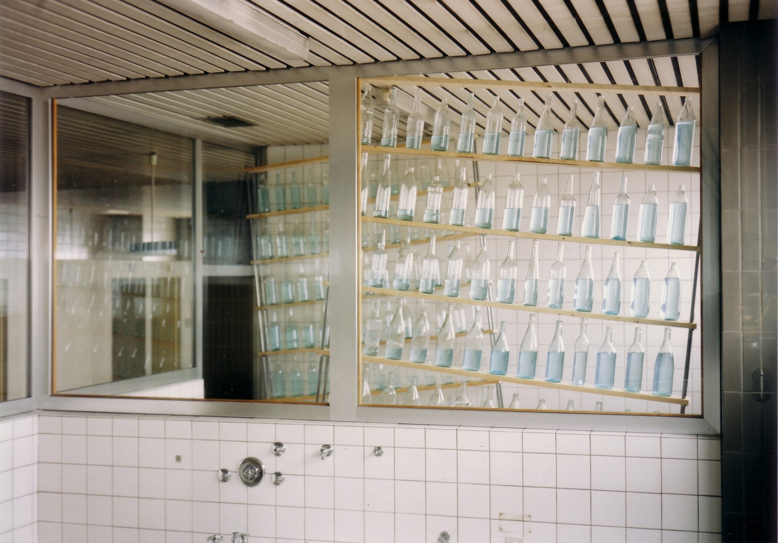 o.T. Rauminstallation aus Regalen, Flaschen und gefärbtem Wasser gezeigt in der Ausstellung „Letzter Aufguss“ ehemaliges Wellenbad Grünstraße Düsseldorf 1996 Fotos von Susanne Brodhage
