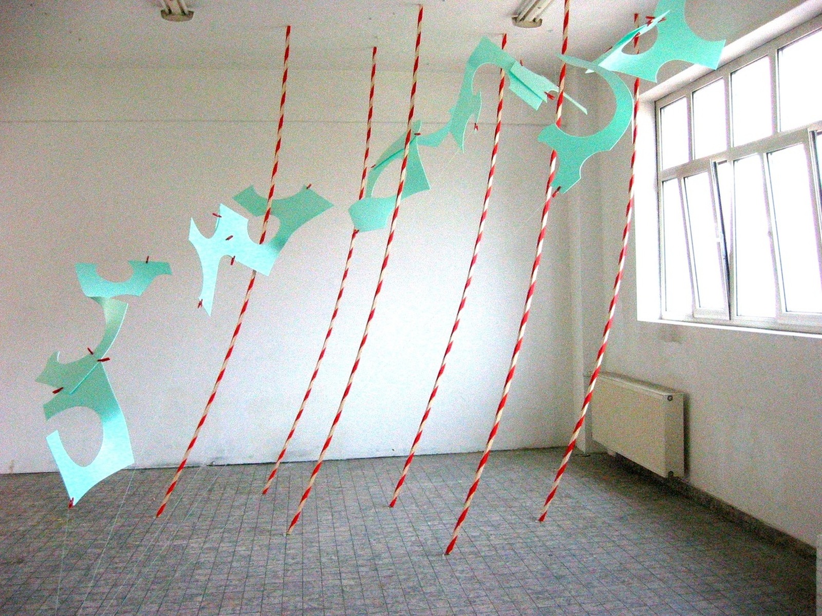 Rauminstallation aus Pappe, Temperafarbe, Spiegelfolie, Schnur