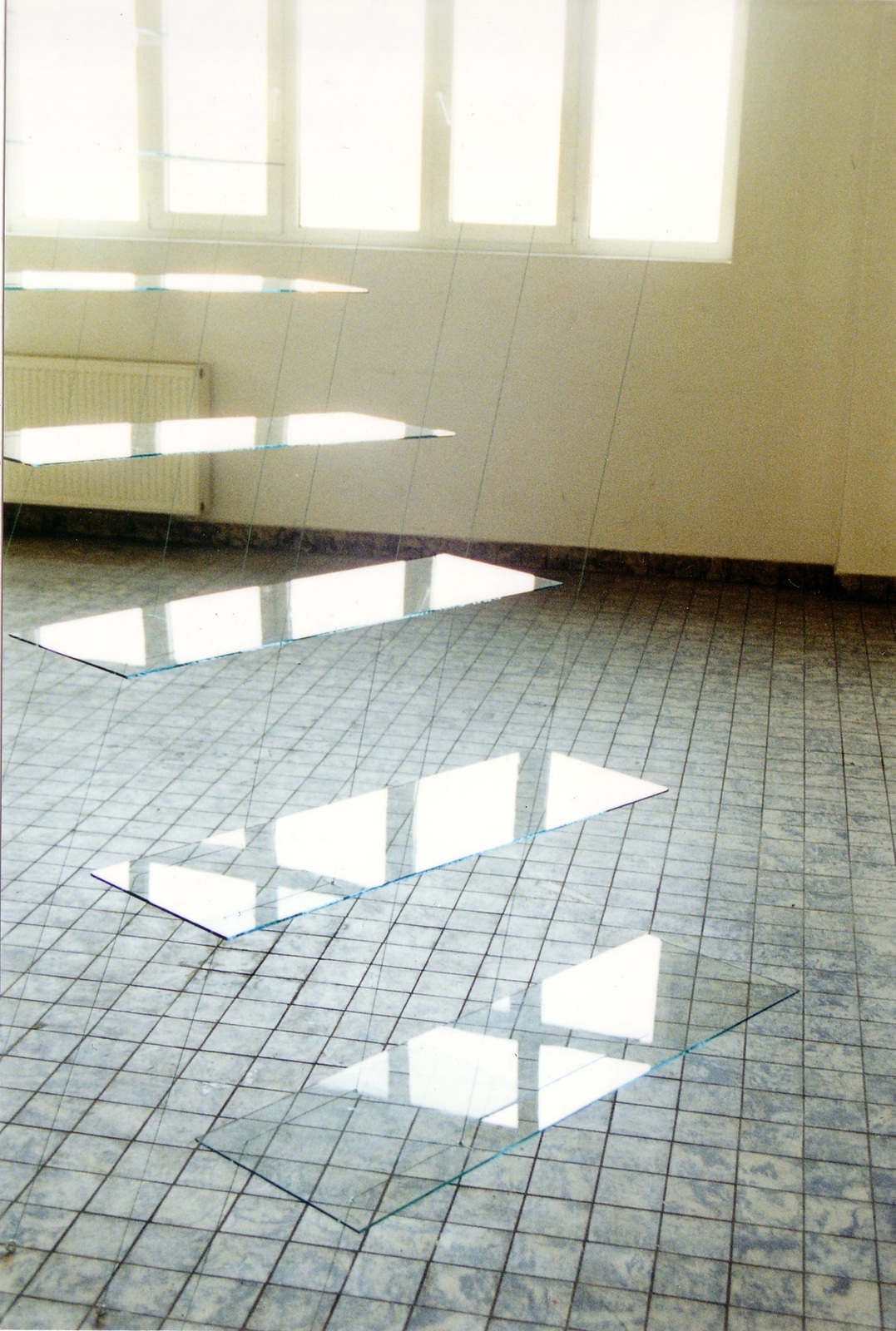 aus zwischen Boden und Decke verspannten Glasplatten
